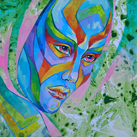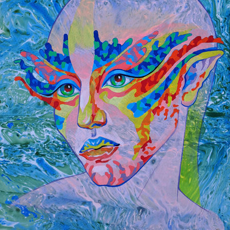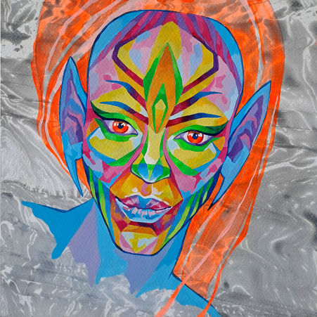 I use a unique technique in this series: vivid oil-painted backgrounds on paper, layered with acrylic to bring the creatures to life. The result is a richly textured and colorful world where the familiar and the alien merge